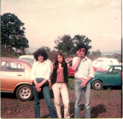 198?Tres alumnos de pie en un exterior, uno fuma. Al fondo se ven automoviles. Ven a la cámara